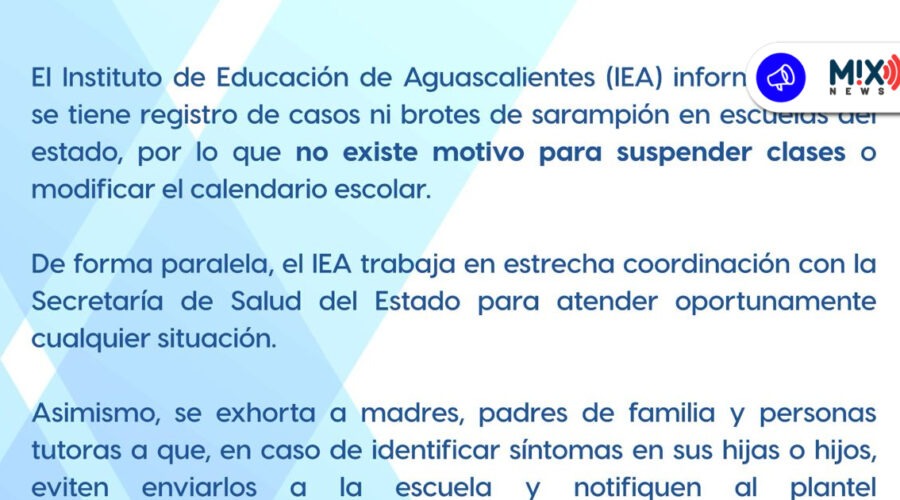 Frida Fonseca QuezadaAguascalientes, Ags.– El Instituto de Educación de Aguascalientes (IEA) informó de manera oficial que no existe registro de casos ni brotes de sarampión …