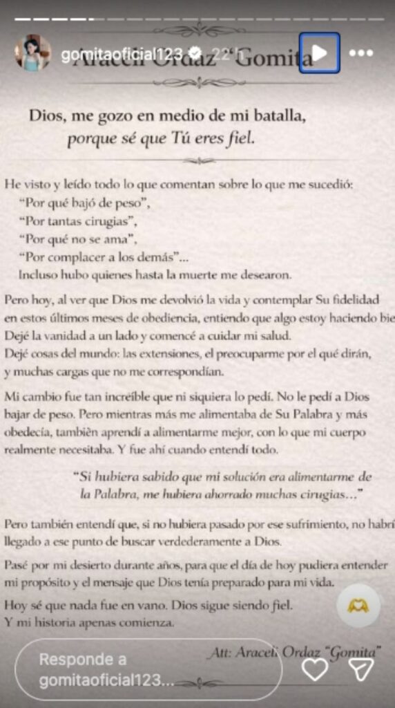 Lejos de la Gomita explosiva y amante de los reflectores, ahora se muestra más introspectiva. Contó que su acercamiento al cristianismo ha sido clave en esta nueva etapa y que, según ella, esa conexión espiritual la ayudó a sanar desde adentro. Asegura que empezó a dejar atrás la vanidad, cambió hábitos, mejoró su alimentación y su salud comenzó a transformarse.