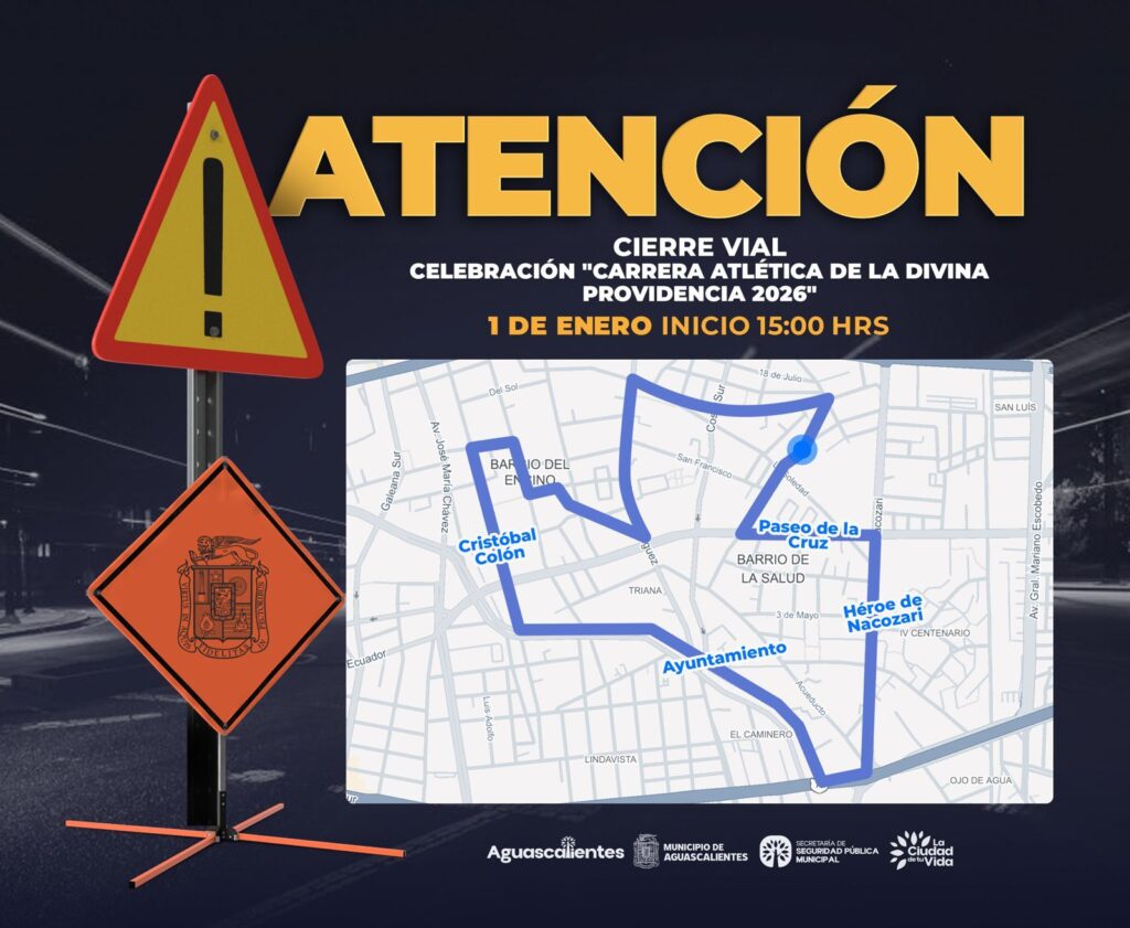 Aguascalientes, Ags.– Con motivo de la Carrera Atlética de la Divina Providencia 2026, la Secretaría de Seguridad Pública Municipal (SSPM), a través de la Dirección de Movilidad y Tránsito, implementarán cierres viales en diversos puntos de la ciudad este jueves 1 de enero, por lo que se exhorta a la ciudadanía a tomar precauciones.