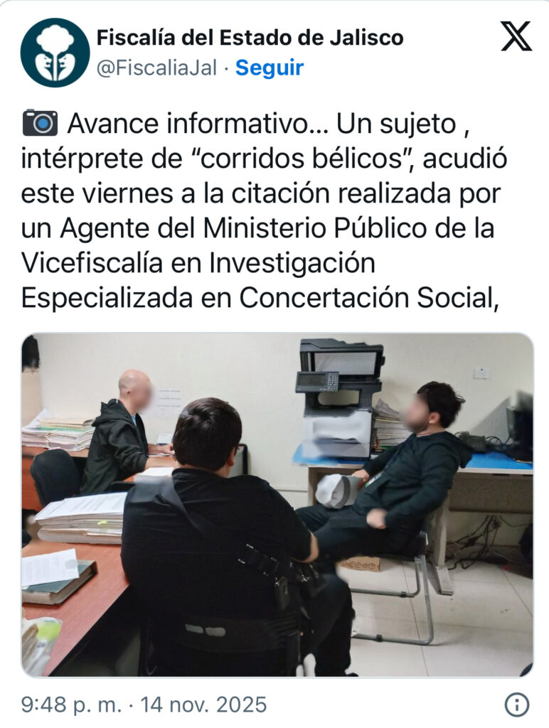 La autoridad abrió una carpeta para determinar si el artista incurrió en apología del delito durante una presentación en el Palenque de las Fiestas de Octubre, donde supuestamente interpretó un tema que exalta a figuras del crimen organizado. Y eso basta para activar el artículo 142 del Código Penal jalisciense.