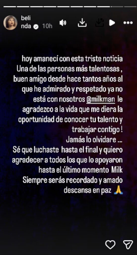 La noticia sacudió especialmente a Belinda, amiga cercana y colaboradora del creativo en el tema “Sueño de ti”. Durante su hospitalización pidió apoyo y oraciones; tras su muerte, le dedicó un mensaje lleno de cariño, recordándolo como uno de los artistas más talentosos que conoció.
