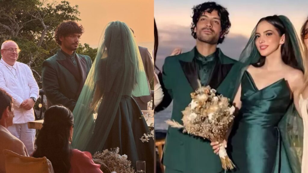 Lejos del típico blanco nupcial, Paty Cantú apostó por un vestido verde esmeralda de satín que se robó todas las miradas. El diseño, acompañado de un velo de tul, transformó por completo la estética clásica y marcó tendencia desde el primer instante.