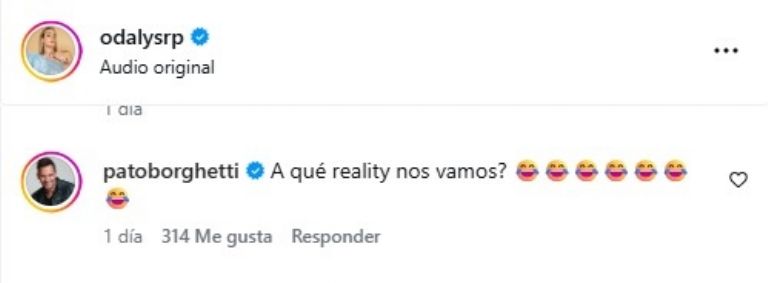 Quien no se aguantó las ganas de reaccionar fue su esposo, Pato Borghetti, que desde la trinchera de Venga La Alegría le escribió en redes un mensajito que inmediatamente prendió las alarmas del espectáculo. El argentino le lanzó una pregunta que huele a spoiler: “¿A qué reality nos vamos?”, justo cuando los rumores los apuntan como futuros participantes de “¿Apostarías por mí?”.