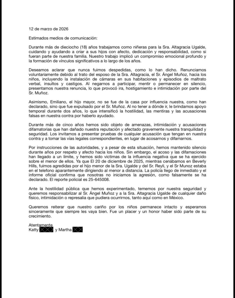 Otro punto que abordaron en su carta fue la polémica salida del hijo mayor de la cantante, tema que había generado diversas versiones en los medios. De acuerdo con ellas, el joven no abandonó la casa por influencia de las niñeras, sino que habría sido expulsado por el propio empresario. Ante esa situación, aseguran que decidieron apoyarlo temporalmente durante un periodo de aproximadamente dos años.